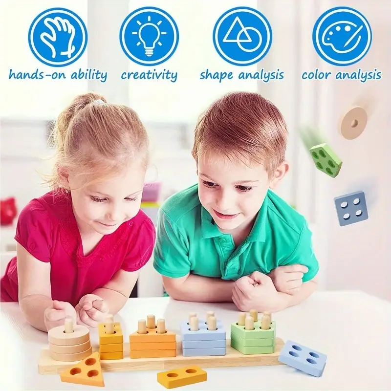 Kwadraty, trójkąty, koła i prostokąty – każde z nich ma swoje miejsce. Dziecko ćwiczy logiczne myślenie i spostrzegawczość, dopasowując elementy do odpowiednich słupków.